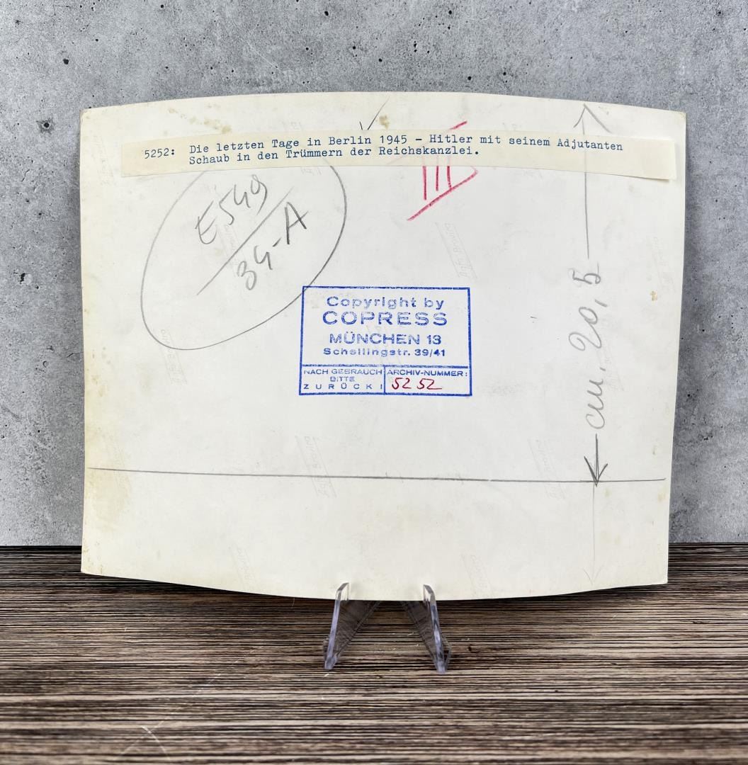 Titled The Last Days In Berlin. Copress Munich press photo. 9 1/4" by 6 3/4". This is the last photo ever taken of Adolf Hitler.