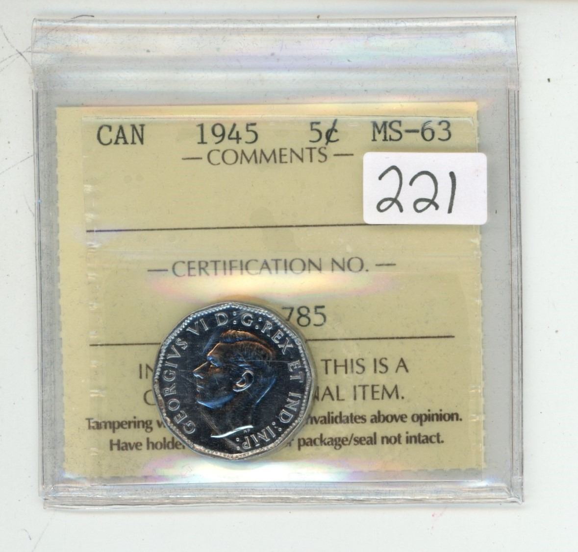 1945 ICCS graded, Canadian 5 cent coin - MS63