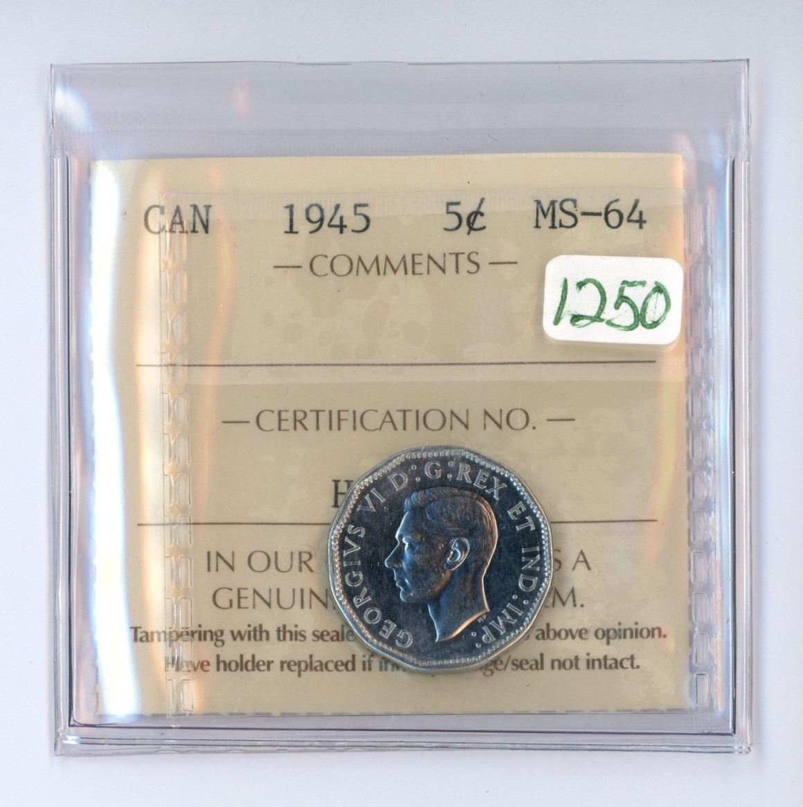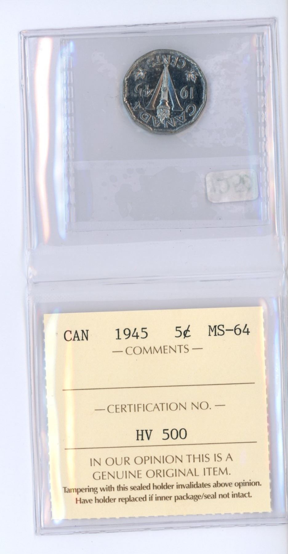 1945 ICCS graded, Canadian 5 cent coin - MS64