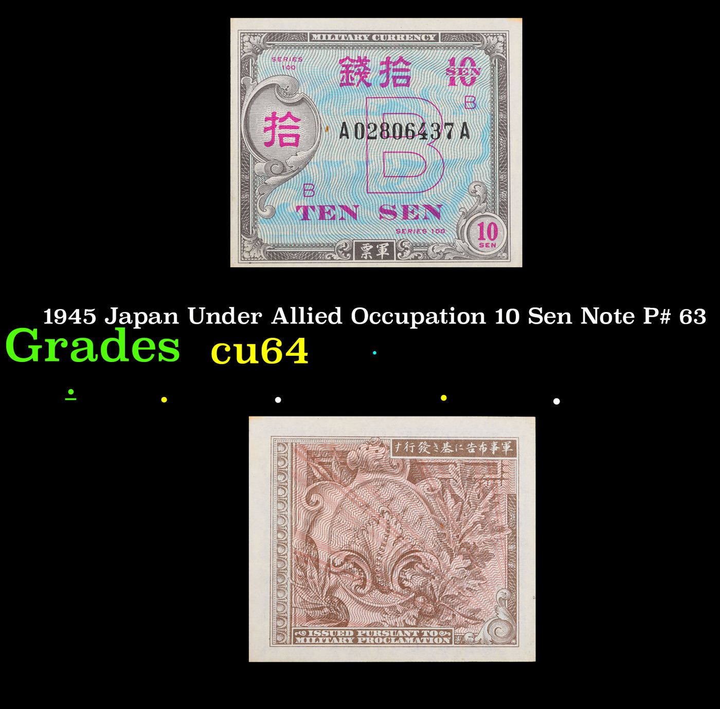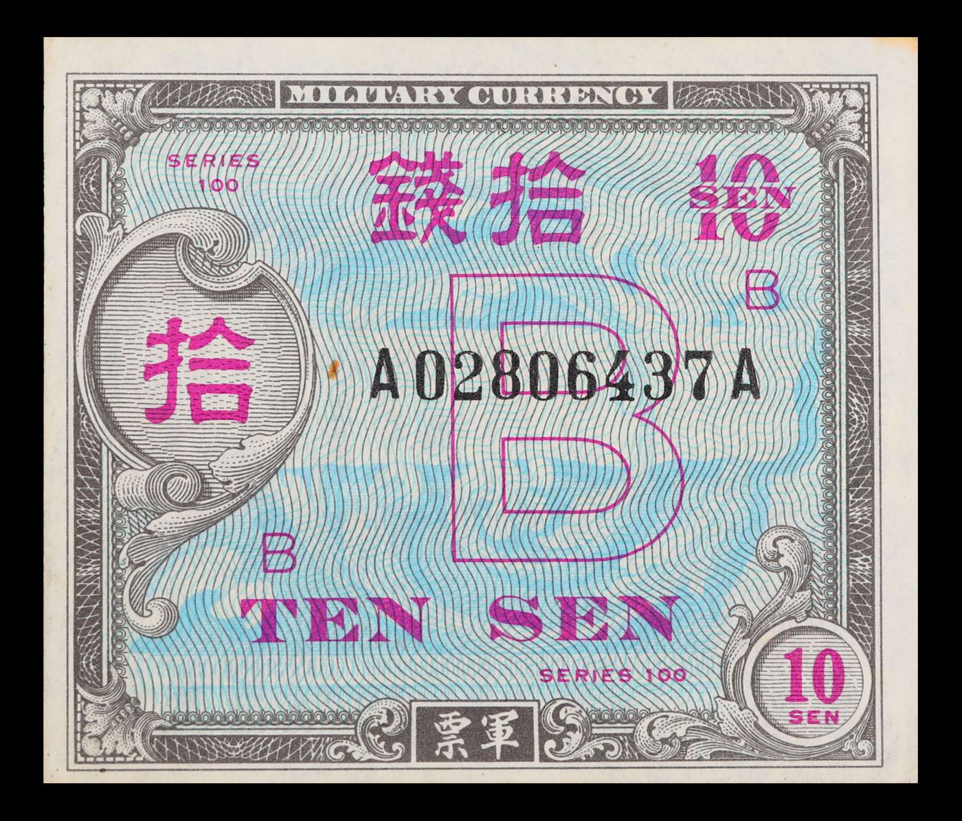 1945 Japan Under Allied Occupation 10 Sen Note P# 63 Grades Choice CU. "B yen" was a colloquial term used to refer to a form of military scrip used in post-war US-Occupied Okinawa from 1946 to 1948. Officially, it was called B type military scrip. The B yen bills were of a blue or green color, and came in eight different denominations. Though the rest of Occupied Japan continued to use regular Japanese yen throughout occupation, military scrip was introduced in Okinawa because, even at that time, the US military government intended to continue occupation of Okinawa long after ending it in the Home Islands. Steps were taken to prevent inflation which would have resulted from the illegal influx of regular yen from the Home Islands. Once the economy in Okinawa was considered stable enough, the B yen was done away with, and the US dollar brought into use.