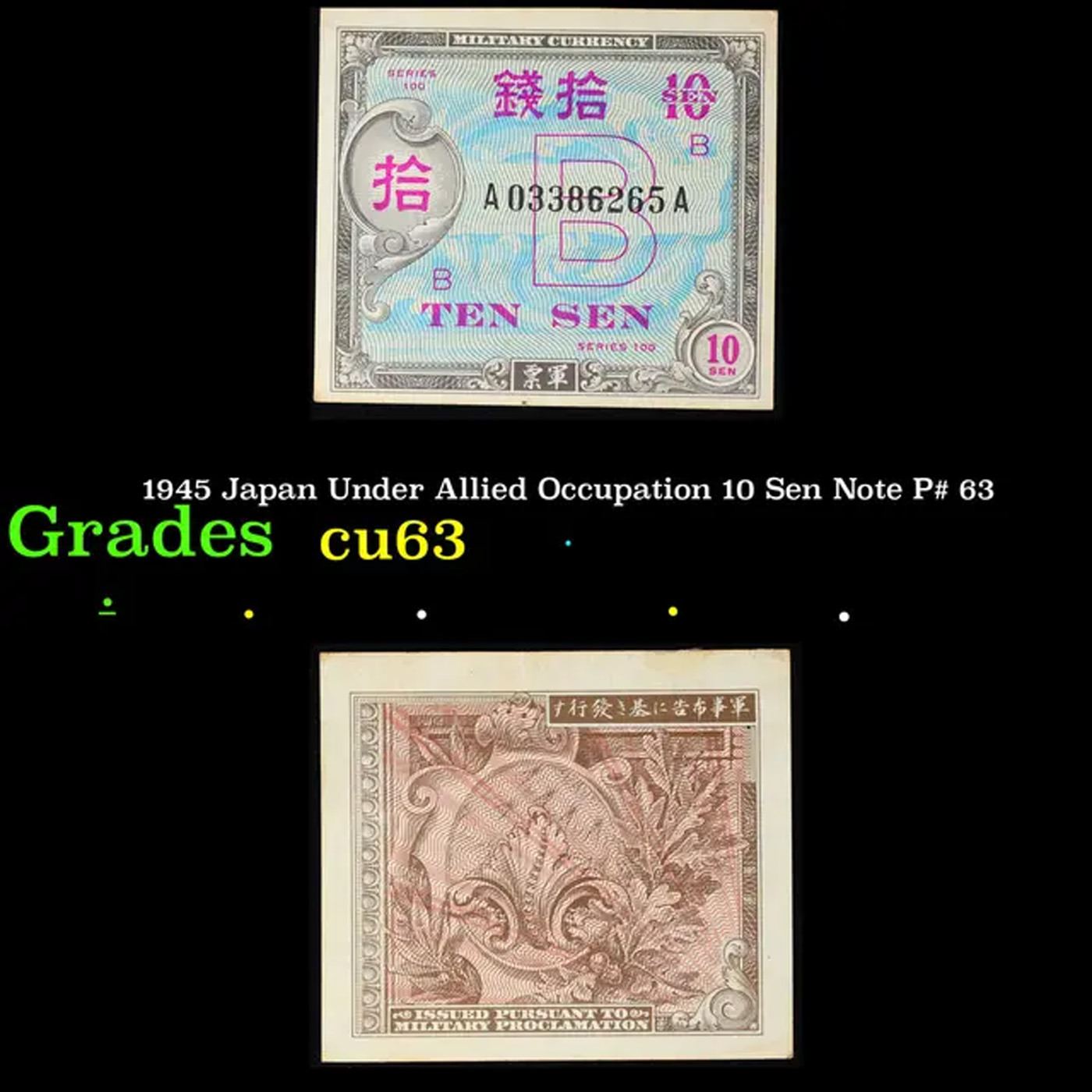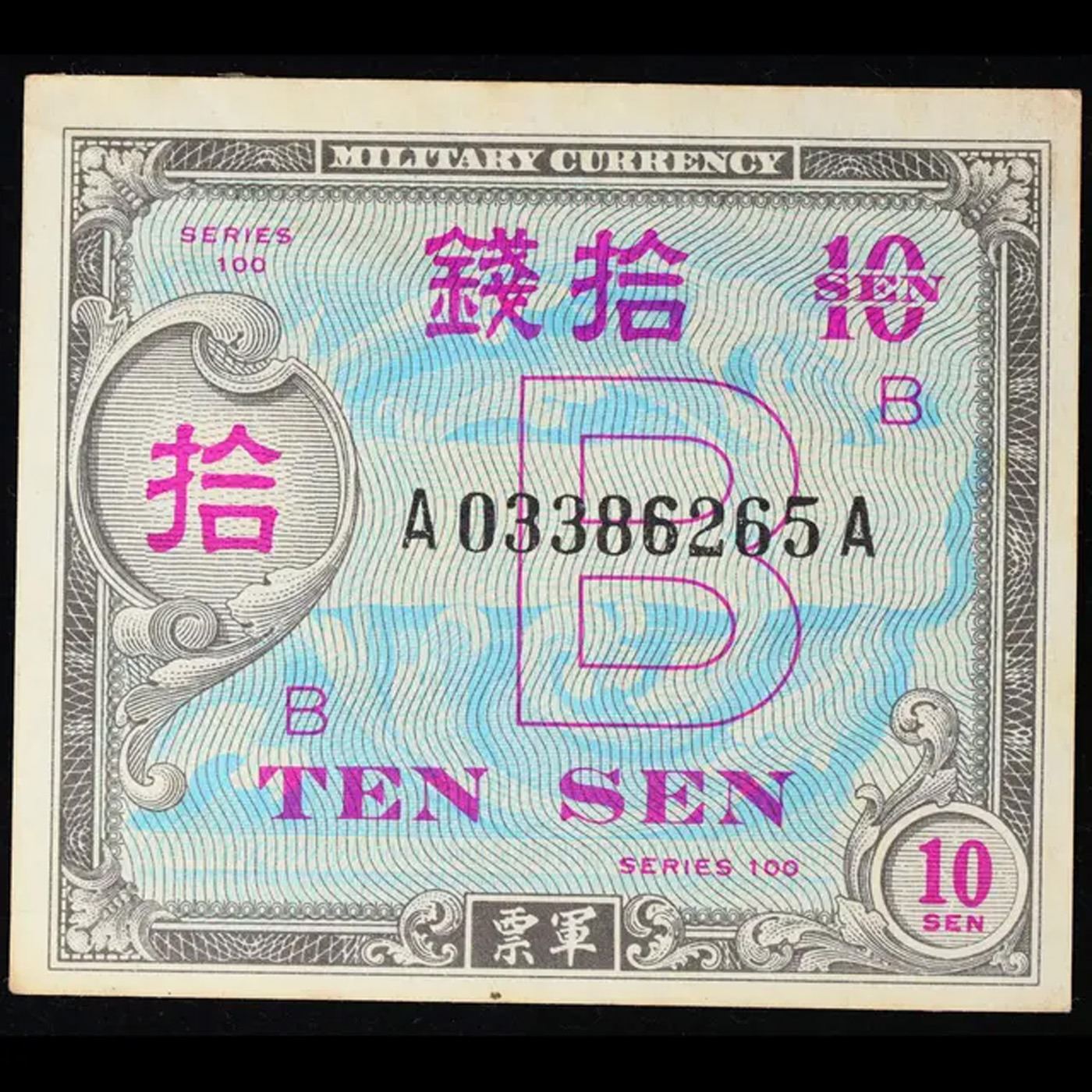 1945 Japan Under Allied Occupation 10 Sen Note P# 63 Grades Select CU. "B yen" was a colloquial term used to refer to a form of military scrip used in post-war US-Occupied Okinawa from 1946 to 1948. Officially, it was called B type military scrip. The B yen bills were of a blue or green color, and came in eight different denominations. Though the rest of Occupied Japan continued to use regular Japanese yen throughout occupation, military scrip was introduced in Okinawa because, even at that time, the US military government intended to continue occupation of Okinawa long after ending it in the Home Islands. Steps were taken to prevent inflation which would have resulted from the illegal influx of regular yen from the Home Islands. Once the economy in Okinawa was considered stable enough, the B yen was done away with, and the US dollar brought into use.