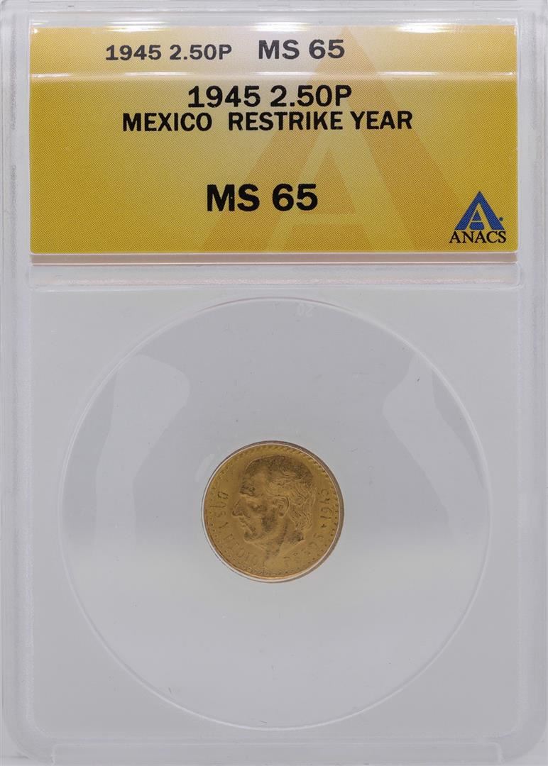 One 1945 Mexico 2 1/2 Pesos Gold Coin ANACS MS65. ANACS Certified.
