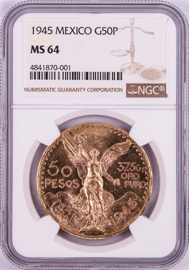 One 1945 Mexico 50 Pesos Gold Coin NGC MS64. NGC Certified.