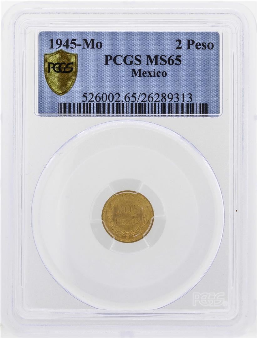 One 1945-Mo Mexico 2 Pesos Gold Coin PCGS MS65. PCGS Certified.