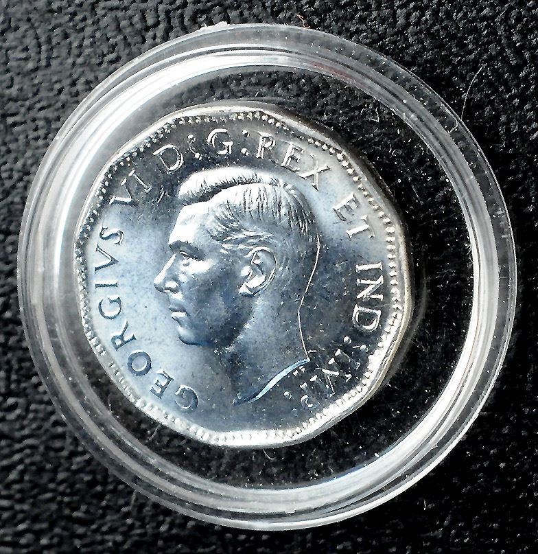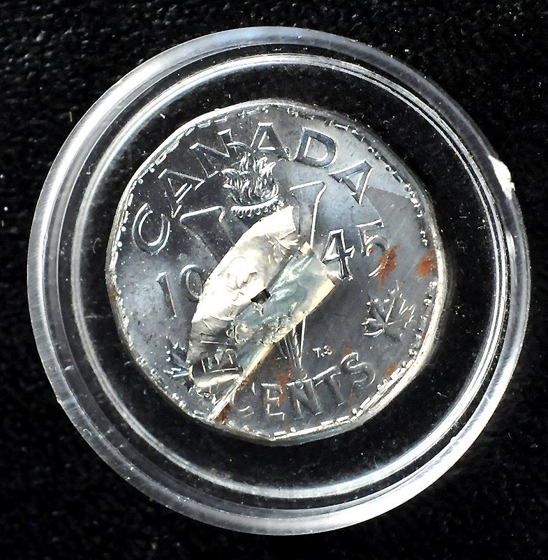 Five Cents, 1945, with thin brassy metal add-on, Attached to reverse at lower end. Showing incuse impression. 4.39 gr.