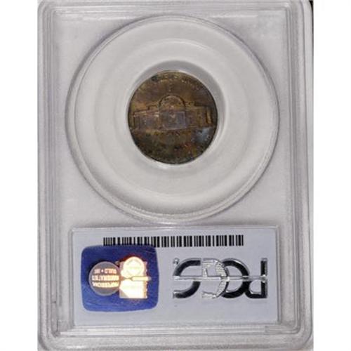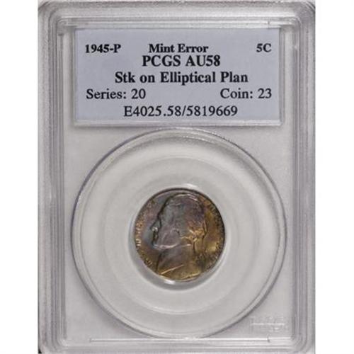<B>1945-P 5C Jefferson War Nickel--Struck on an Elliptical Planchet--AU58 PCGS.</B></I> Slightly out of round along the right borders with minor planchet roughness. The peripheral legends stretch as they approach the rim, a characteristic of undersized planchet or broadstruck errors. Wildly toned in sky-blue, plum-red, and lemon shades.<BR><BR><B>Coin Engraver:</B> Felix Schlag<BR><BR><b>Shipping:</b> Coins & Currency (<a target="_blank" href="http://www.heritageauctions.com/common/shipping.php">view shipping information</a>)
