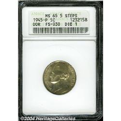 <B>1945-P<5C> Doubled Die Reverse MS65 Full Steps ANACS.</B></I> FS-030, Die 1. Doubling is strongest on CELLO of MONTICELLO and CENTS. Lustrous surfaces reveal a hint of gold toning. Minute marks on Jefferson's cheek and collar are noted for accuracy. <BR><BR><B>Important notice:</B> Heritage usually auctions material at the rate of 200-250 lots per hour. On some occasions eBay Live bid software or the Internet may not be able to keep up with the pace of the auction. We recommend placing a realistic absentee bid now as insurance to avoid disappointment. Occasionally the auctioneer may eliminate or reject an eBay Live bid, and the auctioneer may also reopen a lot after the close of the eBay live bidding (usually because we missed an audience bid), and may reject your bid even if it shows you as the winning bidder. By bidding via eBay Live, you agree that Heritage may award the lot to another bidder at its sole discretion under the circumstances described above or any other reasonable circumstances. Since eBay bids are not shown to us until we open the lot on the floor, we treat those bids just like floor bids. In most cases the floor responds before the eBay bid is presented to us, due to Internet lag time, so for consistency we have made it a policy that floor bids are always considered first over tie eBay live bids. Also please note that all Heritage lots purchased through eBay Live carry a 20% Buyer's Premium. Please make sure you read the Terms and Conditions before you bid.