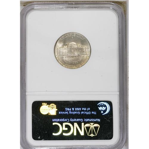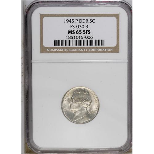 <B>1945-P 5C Doubled Die Reverse MS65 Full Steps NGC.</B></I> A solidly struck and frosty example, lightly gold-toned on the reverse, that has doubling most prominent at the lower lettering. Listed on page 130 of the 2007 <I>Guide Book.</B></I><BR><BR><b>Shipping:</b> Coin/Currency (<a target="_blank" href="http://www.heritageauctions.com/common/shipping.php">view shipping information</a>)