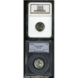 <TABLE cellSpacing=0 cellPadding=0 width="100%" bgColor=#000000 border=0><TBODY><TR><TD width="100%"><TABLE cellSpacing=1 cellPadding=3 width="100%" border=0><TBODY><TR><TD width="100%" bgColor=#79735c><FONT face=arial color=#ffffff size=3><B>Description</B> </FONT></TD></TR><TR><TD width="100%" bgColor=#ffffff><FONT face=arial size=2><B>1940-D 5C MS67 * NGC,</B></I> the right border has honey-gold color, lustrous and beautifully preserved, a good strike; and a <B>1945-P MS67 PCGS,</B></I> Ex: Benson, the steps are not fully struck but this lightly toned and well preserved Superb Gem has imposing eye appeal. (2 coins) </FONT></TD></TR></TBODY></TABLE></TD></TR></TBODY></TABLE><BR><A name=PricesRealized></A><TABLE cellSpacing=0 cellPadding=0 width="100%" bgColor=#000000 border=0><TBODY><TR><TD width="100%"><TABLE cellSpacing=1 cellPadding=3 width="100%" border=0><TBODY><TR><TD width="100%" bgColor=#79735c><A name=PR><FONT face=arial color=#ffffff size=3><B>Previous Prices from Heritage Auctions</B> </FONT></A></TD></TR><TR><TD bgColor=#f6f6ed><TABLE cellSpacing=0 cellPadding=0 width="100%" border=1><TBODY><TR><TD align=middle width="33%"><B>Date</B></TD><TD align=middle width="33%"><B>Service</B></TD><TD align=middle width="33%"><B>Price</B></TD></TR><TR bgColor=whitesmoke><TD width="33%"><B>04/09/2002</B></TD><TD width="33%">NGC</TD><TD width="33%">$26.45</TD></TR><TR bgColor=whitesmoke><TD width="33%"><B>11/17/2001</B></TD><TD width="33%">NGC</TD><TD width="33%">$34.50</TD></TR><TR bgColor=whitesmoke><TD width="33%"><B>06/26/2001</B></TD><TD width="33%">NGC</TD><TD width="33%">$15.00</TD></TR><TR bgColor=whitesmoke><TD width="33%"><B>03/28/2000</B></TD><TD width="33%">NGC</TD><TD width="33%">$15.00</TD></TR><TR bgColor=whitesmoke><TD width="33%"><B>02/15/2000</B></TD><TD width="33%">NGC</TD><TD width="33%">$20.00</TD></TR><TR bgColor=whitesmoke><TD width="33%"><B>02/01/2000</B></TD><TD width="33%">NGC</TD><TD width="33%">$16.00</TD></TR><TR bgColor=whitesmoke><TD width="33%"><B>04/11/2000</B></TD><TD width="33%">NGC</TD><TD width="33%">$13.00</TD></TR><TR bgColor=whitesmoke><TD width="33%"><B>02/08/2000</B></TD><TD width="33%">NGC</TD><TD width="33%">$60.00</TD></TR><TR bgColor=whitesmoke><TD width="33%"><B>03/14/2000</B></TD><TD width="33%">NGC</TD><TD width="33%">$16.00</TD></TR></TBODY></TABLE></TD></TR><TR><TD bgColor=#ffffff><FONT face=arial size=1 ?>PLEASE NOTE: All prices realized reflect the final hammer price PLUS the buyer's premium in auctions that charge a buyer's premium. Each item has a notation at the top of the listing indicating whether that lot included a buyer's premium. Example: A item that sells with a final hammer price of $100 and a 20% buyer's premium will display with a price realized of $120. All information listed is intended to be as accurate as possible, but errors are possible. Please use this guide carefully and inform us of any inaccuracies. </FONT></TD></TR></TBODY></TABLE></TD></TR></TBODY></TABLE><BR><TABLE cellSpacing=0 cellPadding=0 width="100%" bgColor=#000000 border=0><TBODY><TR><TD width="100%"><TABLE cellSpacing=1 cellPadding=3 width="100%" border=0><TBODY><TR><TD width="100%" bgColor=#79735c colSpan=6><FONT face=arial color=#ffffff size=3><B>Price Guide*</B> </FONT></TD></TR><TR bgColor=#f6f6ed><TD align=middle><B>Grade</B> </TD><TD align=middle><B>Coin World<BR>(Trends)</B> </TD><TD align=middle><B>Numismedia<BR>Retail</B> </TD><TD align=middle><B>Numismedia<BR>Wholesale</B> </TD><TD align=middle><B>Coin<BR>Universe</B> </TD><TD align=middle><B>Heritage<BR>Value Index</B> </TD></TR><TR><TD colSpan=6>No Pricing Data Available</TD></TR><TR bgColor=#ffffff><TD colSpan=6><FONT size=1>*All information listed is intended to be as accurate as possible, but errors are possible. No item may be returned or refused based on this information which is provided as a service to our customers. You should contact each pricing source directly to determine the accuracy of this information. </FONT></TD></TR></TBODY></TABLE></TD></TR></TBODY></TABLE><BR><TABLE cellSpacing=0 cellPadding=0 width="100%" bgColor=#000000 border=0><TBODY><TR><TD width="100%"><TABLE cellSpacing=1 cellPadding=3 width="100%" border=0><TBODY><TR><TD width="100%" bgColor=#79735c><FONT face=arial color=#ffffff size=3><B>Population Guide</B> </FONT></TD></TR><TR bgColor=#ffffff><TD align=middle><!-- Begin Output of Population Grid--><TABLE cellSpacing=0 cellPadding=0 width="100%" border=0><TBODY><TR><TD vAlign=center><TABLE cellSpacing=0 width="100%" border=1 cellsadding="3"><TBODY><TR><TD vAlign=center><TABLE cellSpacing=0 cellPadding=3 width="100%" border=1><TBODY><TR><TD vAlign=center align=middle bgColor=#f0f1e8 colSpan=2 <CENTER><FONT face=Arial size=2><B>PCGS Pop </B></FONT><CENTER></CENTER></TD><TD vAlign=center align=middle bgColor=#f0f1e8 colSpan=2><CENTER><FONT face=Arial size=2><B>NGC Pop</B></CENTER></FONT></TD></TR><TR><TD vAlign=center><FONT face=Arial size=2>(67)</FONT> </TD><TD vAlign=center align=right><FONT face=Arial size=2>2</FONT> </TD><TD vAlign=center><FONT face=Arial size=2>(67)</FONT> </TD><TD vAlign=center align=right><FONT face=Arial size=2>339</FONT> </TD></TR><TR><TD vAlign=center><FONT face=Arial size=2>(>67)</FONT> </TD><TD vAlign=center align=right><FONT face=Arial size=2>0</FONT> </TD><TD vAlign=center><FONT face=Arial size=2>(>67)</FONT> </TD><TD vAlign=center align=right><FONT face=Arial size=2>0</FONT> </TD></TR></TBODY></TABLE></TD></TR></TBODY></TABLE></TD></TR></TBODY></TABLE><!-- End Output of Population Grid--> 2 coins Important notice: Heritage usually auctions material at the rate of 200-250 lots per hour. On some occasions eBay Live bid software or the Internet may not be able to keep up with the pace of the auction. We recommend placing a realistic absentee bid now as insurance to avoid disappointment. Occasionally the auctioneer may eliminate or reject an eBay Live bid, and the auctioneer may also reopen a lot after the close of the eBay live biddin