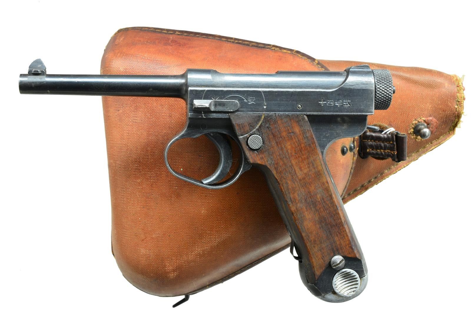 PISTOL WITH 2 MATCHING MAGAZINES & CLAM SHELL HOLSTER. Cal. 8mm. S# 70141. Bbl. 4 1/2". Standard late war production w/ date marking for May 1945. Has plain hardwood grips. UNATTACHED ACCESSORIES: Clam shell holster made of rubberized canvas. Contains cleaning rod. MAGS: 2 aluminum base w/ matching numbers. CONDITION: fine. Retaining approx. 85% original blue. Silvered on sharp edges. There are marks from operation of safety. Bright shiny bore. Mechanically fine. Holster shows some scuffs. Stitching on clamshell lid has let go & is detached. Cover retaining strap stretched. (21-1405/MGM). CURIO. $800-1,200.