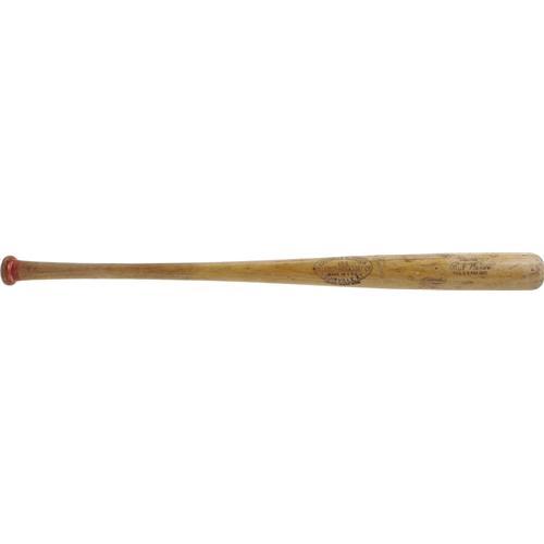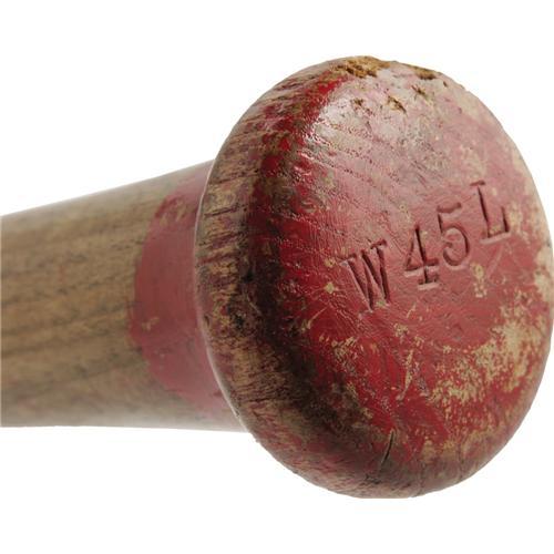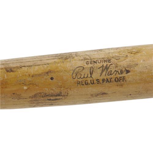 <B>1945 Paul Waner Game Used Bat.</B></I> Collectors of New York Yankees lumber should clamber for this intensely scarce lumber, utilized by the Hall of Fame outfielder during his "blink and you'll miss it" tenure in pinstripes to close out his professional career. Yankee team records indicate a 1945 ship date for this signature model Louisville Slugger W45L, assuring this most special vintage. Weight and length are thirty-four ounces and thirty-five and three-quarter inches respectively. Exceptional use is clearly evident in the form of heavy ball and stitch marks, spike holes and streaks of red paint from the bat rack. The knob still holds a cracking coating of the red paint used by Waner to identify his personal bat. The cracked handle has been professionally repaired, and seven nails have been driven into the barrel for reasons that are unclear. With half a point lost for a chip in the knob, the bat is graded 7.5 by Dave Bushing, the highest possible without direct provenance. This will surely be your only chance to add Paul Waner to your Hall of Fame Yankees collection, so bid now or forever hold your peace. <I>LOA from Dave Bushing.</B></I><BR><BR><b>Shipping:</b> Bats, Clubs, Sticks, Swords, Rif (<a target="_blank" href="http://www.heritageauctions.com/common/shipping.php">view shipping information</a>)