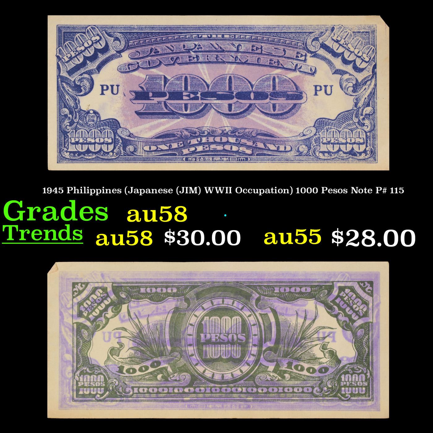 1945 Philippines (Japanese (JIM) WWII Occupation) 1000 Pesos Note P# 115 Grades Choice AU/BU Slider