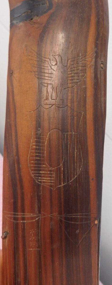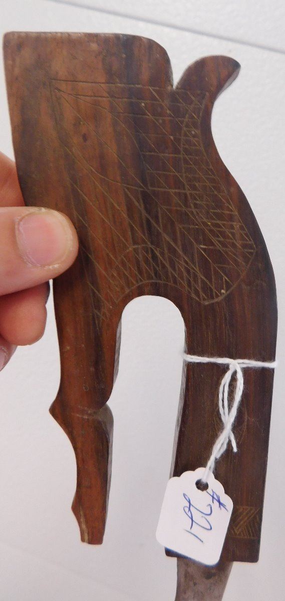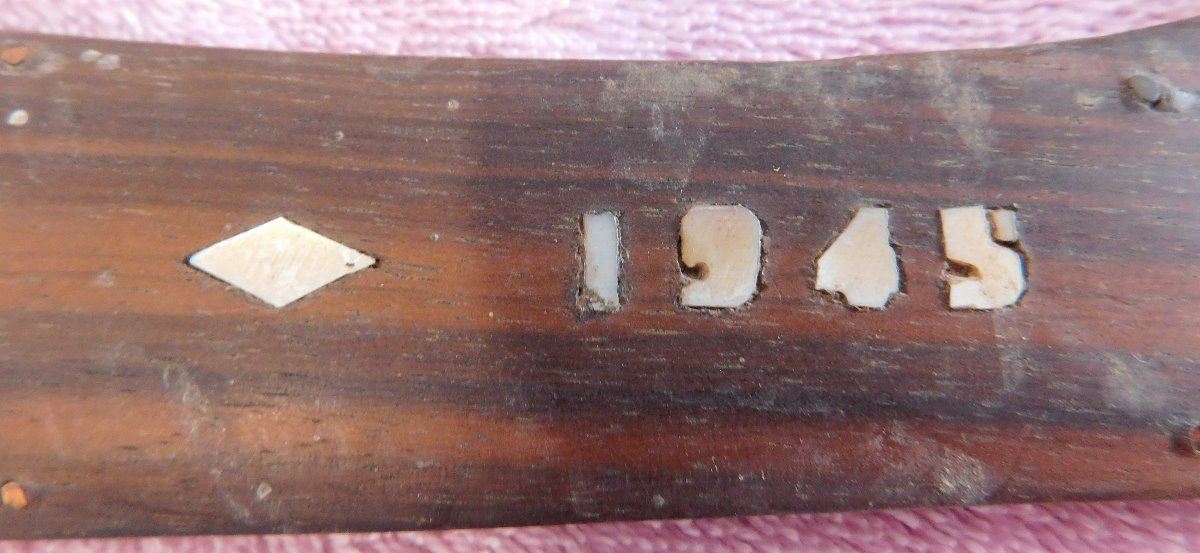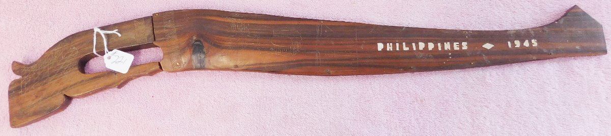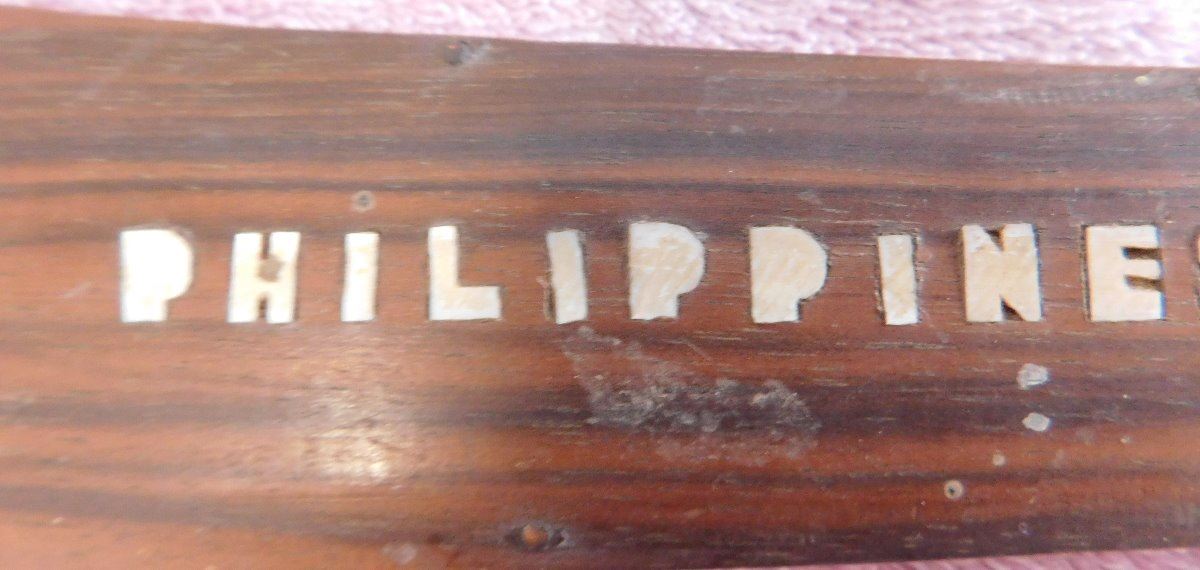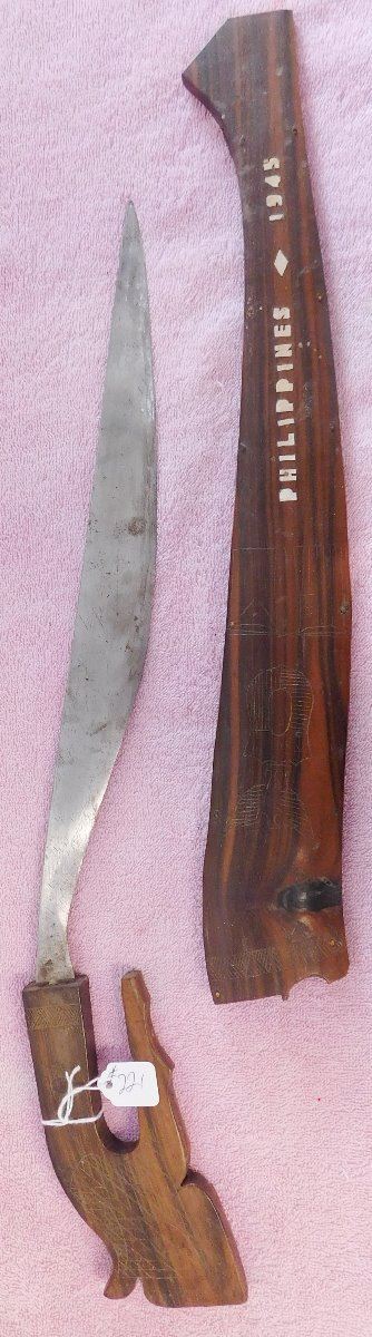 1945 Philippines Sword & Scabbard, circa 1945. Made of steel, wood and hand forged, the item is 23" x 4" x 0.5". Philippines Islands. Has U.S. eagle & P.I. flag engraving with shell inlay and dated. Condition: Good, see images. Shipping: $25.50 due to length, w/insurance and signature.