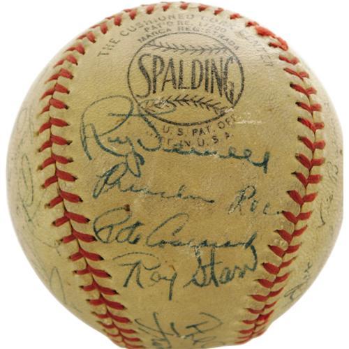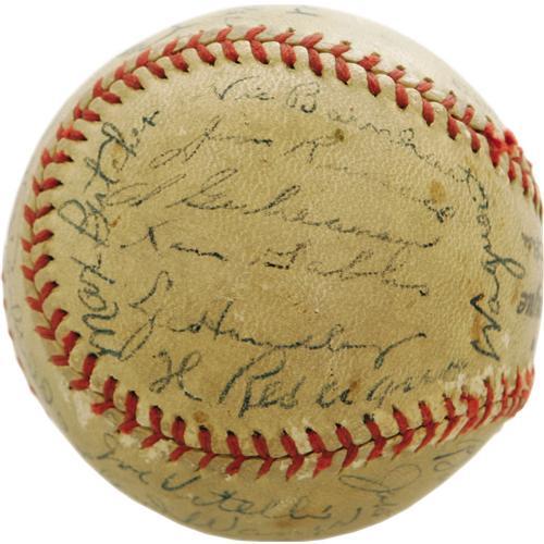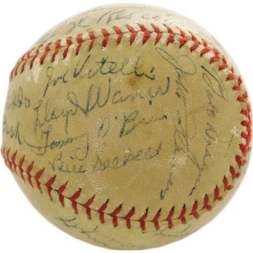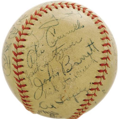 <B>1945 Pittsburgh Pirates Team Signed Baseball with Honus Wagner.</B></I> With the Major League talent pool diminished by the draft, the '45 Bucs still boasted a heaping helping of Hall of Fame luminaries, most notably the seventy-one year old Dutchman who simply signs his last name. Al Lopez, Lloyd Waner and Frank Frisch are too among the twenty-six strong blue ink signatures (8/10 average) on this ONL (Frick) ball. Also noteworthy is Babe Dahlgren, the man who took Yankee first base duties after Lou Gehrig ended his fourteen-year residence there. The ball shows some wear along the laces, but this minor concern does not affect the signatures in any way. Important high-grade autographs make this ball a true Pirates treasure. <I>LOA from PSA/DNA.</B></I>