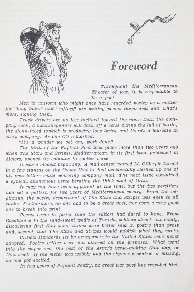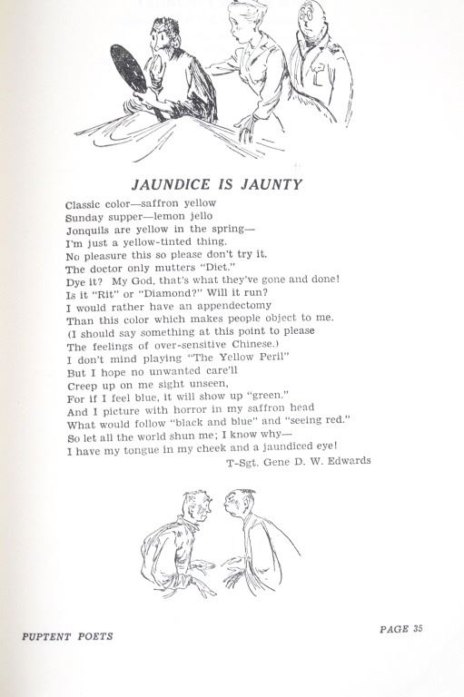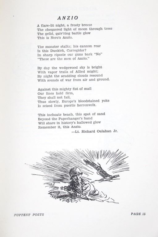 Featured in this lot is this 1945 first edition copy of “Puptent Poets of the Stars and Stripes Mediterranean” compiled by CPL. Charles A. Hogan and CPL. John Welsh III, illustrated by SGT. Stanley Meltzoff, edited by LT. Ed Hill, and published in Italy 1945. The condition of this book is fair, with wear consistent with age and use. The measurements of this book are 9 5/8" x 6 3/4".
