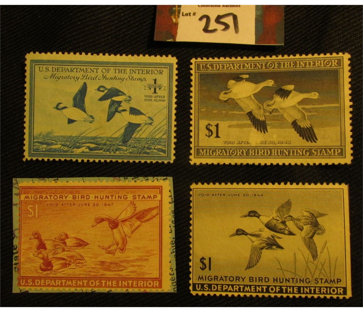1945 RW12 Mint, NG; 1946 RW13 (attached to part of license); 1947 RW14 Mint, slight damage; & 1948 RW15, Mint, hinged Migratory Bird Hunting Stamps.