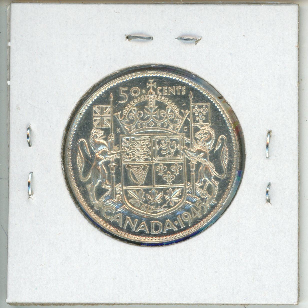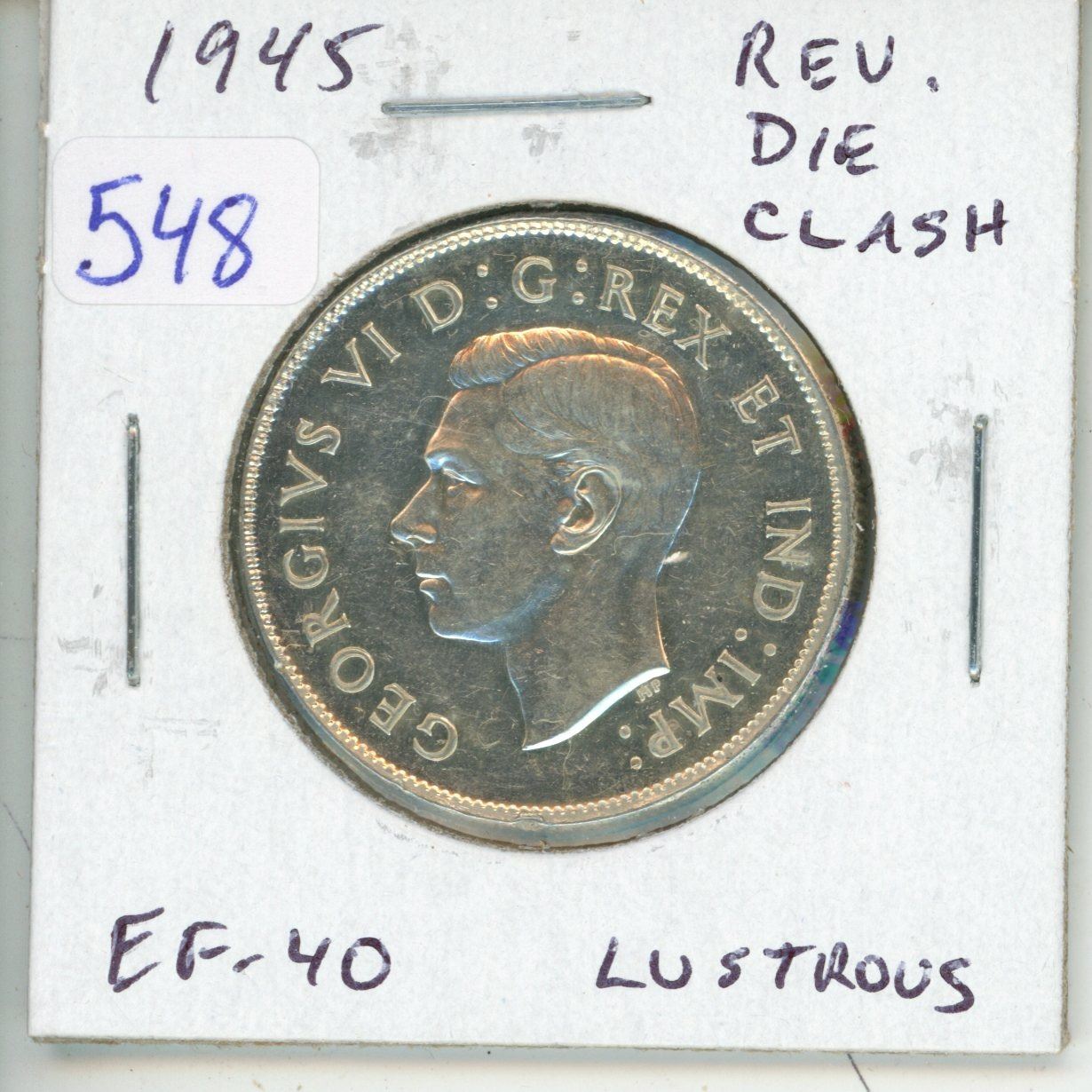 1945 Reverse Die Clash Silver 50 Cents. Part of the king’s head visible on the Reverse. EF-40. Lustrous.