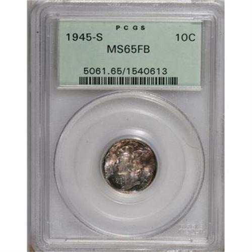 <B>1945-S 10C MS65 Full Bands PCGS.</B></I> PCGS Population (528/479). NGC Census: (66/231). Mintage: 41,920,000. Numismedia Wsl. Price for NGC/PCGS coin in MS65: $100. (#5061)<BR><BR><B>Coin Engraver:</B> Adolph A. Weinman<BR><BR><b>Shipping:</b> Coins & Currency (<a target="_blank" href="http://www.heritageauctions.com/common/shipping.php">view shipping information</a>)