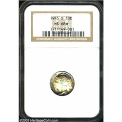<TABLE cellSpacing=0 cellPadding=0 width="100%" bgColor=#000000 border=0><TBODY><TR><TD width="100%"><TABLE cellSpacing=1 cellPadding=3 width="100%" border=0><TBODY><TR><TD width="100%" bgColor=#79735c><FONT face=arial color=#ffffff size=3><B>Description</B> </FONT></TD></TR><TR><TD width="100%" bgColor=#ffffff><FONT face=arial size=2><B>1945-S 10C MS68 * NGC.</B></I> Spectacular golden-brown and navy-blue patina frames the brilliant centers. Well preserved, and nicely struck aside from the central bands. The highest graded by NGC with a star designation. </FONT></TD></TR></TBODY></TABLE></TD></TR></TBODY></TABLE><BR><A name=PricesRealized></A><TABLE cellSpacing=0 cellPadding=0 width="100%" bgColor=#000000 border=0><TBODY><TR><TD width="100%"><TABLE cellSpacing=1 cellPadding=3 width="100%" border=0><TBODY><TR><TD width="100%" bgColor=#79735c><A name=PR><FONT face=arial color=#ffffff size=3><B>Previous Prices from Heritage Auctions</B> </FONT></A></TD></TR><TR><TD bgColor=#f6f6ed><TABLE cellSpacing=0 cellPadding=0 width="100%" border=1><TBODY><TR><TD align=middle width="33%"><B>Date</B></TD><TD align=middle width="33%"><B>Service</B></TD><TD align=middle width="33%"><B>Price</B></TD></TR><TR bgColor=whitesmoke><TD width="33%"><B>12/12/2000</B></TD><TD width="33%">NGC</TD><TD width="33%">$86.00</TD></TR><TR bgColor=whitesmoke><TD width="33%"><B>11/26/2002</B></TD><TD width="33%">NGC</TD><TD width="33%">$166.75</TD></TR><TR bgColor=whitesmoke><TD width="33%"><B>11/25/2002</B></TD><TD width="33%">NGC</TD><TD width="33%">$149.50</TD></TR><TR bgColor=whitesmoke><TD width="33%"><B>09/30/2002</B></TD><TD width="33%">NGC</TD><TD width="33%">$94.30</TD></TR><TR bgColor=whitesmoke><TD width="33%"><B>06/10/2002</B></TD><TD width="33%">NGC</TD><TD width="33%">$120.75</TD></TR><TR bgColor=whitesmoke><TD width="33%"><B>02/24/2002</B></TD><TD width="33%">NGC</TD><TD width="33%">$231.15</TD></TR><TR bgColor=whitesmoke><TD width="33%"><B>01/13/2002</B></TD><TD width="33%">NGC</TD><TD width="33%">$132.25</TD></TR><TR bgColor=whitesmoke><TD width="33%"><B>08/05/2001</B></TD><TD width="33%">NGC</TD><TD width="33%">$189.75</TD></TR><TR bgColor=whitesmoke><TD width="33%"><B>01/06/2001</B></TD><TD width="33%">NGC</TD><TD width="33%">$63.25</TD></TR><TR bgColor=whitesmoke><TD width="33%"><B>08/14/1999</B></TD><TD width="33%">NGC</TD><TD width="33%">$161.00</TD></TR><TR bgColor=whitesmoke><TD width="33%"><B>07/29/2003</B></TD><TD width="33%">NGC</TD><TD width="33%">$322.00</TD></TR><TR bgColor=whitesmoke><TD width="33%"><B>05/05/2003</B></TD><TD width="33%">NGC</TD><TD width="33%">$149.50</TD></TR><TR bgColor=whitesmoke><TD width="33%"><B>08/14/1999</B></TD><TD width="33%">NGC</TD><TD width="33%">$155.25</TD></TR><TR bgColor=whitesmoke><TD width="33%"><B>03/21/2000</B></TD><TD width="33%">NGC</TD><TD width="33%">$120.00</TD></TR><TR bgColor=whitesmoke><TD width="33%"><B>04/11/2000</B></TD><TD width="33%">NGC</TD><TD width="33%">$170.00</TD></TR><TR bgColor=whitesmoke><TD width="33%"><B>01/08/1999</B></TD><TD width="33%">NGC</TD><TD width="33%">$161.00</TD></TR><TR bgColor=whitesmoke><TD width="33%"><B>07/22/2003</B></TD><TD width="33%">NGC</TD><TD width="33%">$120.75</TD></TR><TR bgColor=whitesmoke><TD width="33%"><B>07/22/2003</B></TD><TD width="33%">NGC</TD><TD width="33%">$149.50</TD></TR></TBODY></TABLE></TD></TR><TR><TD bgColor=#ffffff><FONT face=arial size=1 ?>PLEASE NOTE: All prices realized reflect the final hammer price PLUS the buyer's premium in auctions that charge a buyer's premium. Each item has a notation at the top of the listing indicating whether that lot included a buyer's premium. Example: A item that sells with a final hammer price of $100 and a 20% buyer's premium will display with a price realized of $120. All information listed is intended to be as accurate as possible, but errors are possible. Please use this guide carefully and inform us of any inaccuracies. </FONT></TD></TR></TBODY></TABLE></TD></TR></TBODY></TABLE><BR><TABLE cellSpacing=0 cellPadding=0 width="100%" bgColor=#000000 border=0><TBODY><TR><TD width="100%"><TABLE cellSpacing=1 cellPadding=3 width="100%" border=0><TBODY><TR><TD width="100%" bgColor=#79735c colSpan=6><FONT face=arial color=#ffffff size=3><B>Price Guide*</B> </FONT></TD></TR><TR bgColor=#f6f6ed><TD align=middle><B>Grade</B> </TD><TD align=middle><B>Coin World<BR>(Trends)</B> </TD><TD align=middle><B>Numismedia<BR>Retail</B> </TD><TD align=middle><B>Numismedia<BR>Wholesale</B> </TD><TD align=middle><B>Coin<BR>Universe</B> </TD><TD align=middle><B>Heritage<BR>Value Index</B> </TD></TR><TR bgColor=#ffffff><TD align=middle>67</TD><TD align=right>---</TD><TD align=right>$90.00</TD><TD align=right>$69.00</TD><TD align=right>$230.00</TD><TD align=right>$100.50</TD></TR><TR style="FONT-WEIGHT: bold" bgColor=#cccfdd><TD align=middle>68</TD><TD align=right>---</TD><TD align=right>$300.00</TD><TD align=right>$240.00</TD><TD align=right>---</TD><TD align=right>---</TD></TR><TR bgColor=#ffffff><TD align=middle>69</TD><TD align=right>---</TD><TD align=right>---</TD><TD align=right>$1,380.00</TD><TD align=right>---</TD><TD align=right>---</TD></TR><TR bgColor=#ffffff><TD colSpan=6><FONT size=1>*All information listed is intended to be as accurate as possible, but errors are possible. No item may be returned or refused based on this information which is provided as a service to our customers. You should contact each pricing source directly to determine the accuracy of this information. </FONT></TD></TR></TBODY></TABLE></TD></TR></TBODY></TABLE><BR><TABLE cellSpacing=0 cellPadding=0 width="100%" bgColor=#000000 border=0><TBODY><TR><TD width="100%"><TABLE cellSpacing=1 cellPadding=3 width="100%" border=0><TBODY><TR><TD width="100%" bgColor=#79735c><FONT face=arial color=#ffffff size=3><B>Population Guide</B> </FONT></TD></TR><TR bgColor=#ffffff><TD align=middle><!-- Begin Output of Population Grid--><TABLE cellSpacing=0 cellPadding=0 width="100%" border=0><TBODY><TR><TD vAlign=c