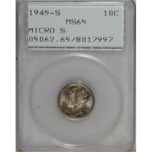 <B>1945-S 10C Micro S MS65 PCGS.</B></I> PCGS Population (1015/1620). NGC Census: (203/495). Mintage: 41,920,000. Numismedia Wsl. Price for NGC/PCGS coin in MS65: $76. (#5062)<BR><BR><B>Coin Engraver:</B> Adolph A. Weinman<BR><BR><b>Shipping:</b> Coins & Currency (<a target="_blank" href="http://www.heritageauctions.com/common/shipping.php">view shipping information</a>)