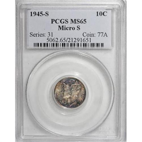 <B>1945-S 10C Micro S MS65 PCGS.</B></I> PCGS Population (1015/1620). NGC Census: (203/496). Mintage: 41,920,000. Numismedia Wsl. Price for NGC/PCGS coin in MS65: $76. (#5062)<BR><BR><B>Coin Engraver:</B> Adolph A. Weinman<BR><BR><b>Shipping:</b> Coins & Currency (<a target="_blank" href="http://www.heritageauctions.com/common/shipping.php">view shipping information</a>)