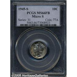 <B>1945-S 10C Micro S MS66 Full Bands PCGS.</B></I> Lushly toned in golden-brown, powder-blue, and fire-red colors, this lustrous and intricately struck premium Gem has eye appeal beyond its technical grade. A couple of minor marks on the reverse do not merit individual mention.