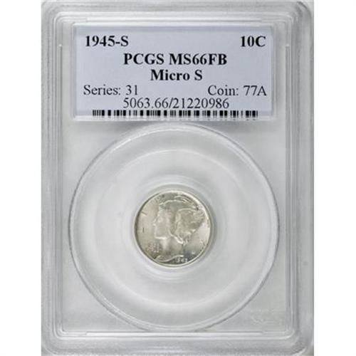<B>1945-S 10C Micro S MS66 Full Bands PCGS.</B></I> A boldly struck example of this popular final-year <I>Guide Book</B></I> variety, strongly lustrous with a touch of satin. Hazy gold-gray patina graces each side. Beautifully preserved and highly elusive any finer; PCGS has graded just 16 such Full Bands coins (3/08).<BR><BR><B>Coin Engraver:</B> Adolph A. Weinman<BR><BR><b>Shipping:</b> Coins & Currency (<a target="_blank" href="http://www.heritageauctions.com/common/shipping.php">view shipping information</a>)