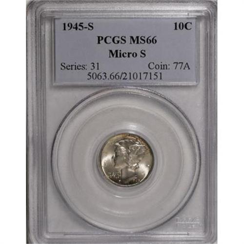 <B>1945-S 10C Micro S MS66 PCGS.</B></I> PCGS Population (1461/161). NGC Census: (359/137). Mintage: 41,920,000. Numismedia Wsl. Price for NGC/PCGS coin in MS66: $110. (#5062)<BR><BR><B>Coin Engraver:</B> Adolph A. Weinman<BR><BR><b>Shipping:</b> Coins & Currency (<a target="_blank" href="http://www.heritageauctions.com/common/shipping.php">view shipping information</a>)