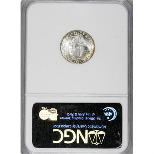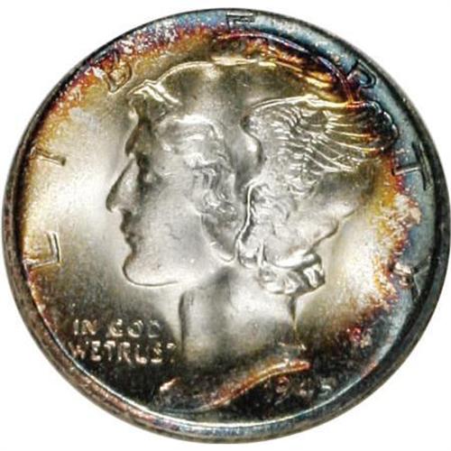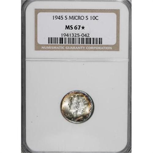 <B>1945-S 10C Micro S MS67<img border='0' src='http://www.heritagecoins.com/images/star.gif' width=10 height=10> NGC.</B></I> NGC Census: (135/7). PCGS Population (158/1). Mintage: 41,920,000. Numismedia Wsl. Price for NGC/PCGS coin in MS67: $281. (#5062)<BR><BR><B>Coin Engraver:</B> Adolph A. Weinman<BR><BR><b>Shipping:</b> Coins & Currency (<a target="_blank" href="http://www.heritageauctions.com/common/shipping.php">view shipping information</a>)
