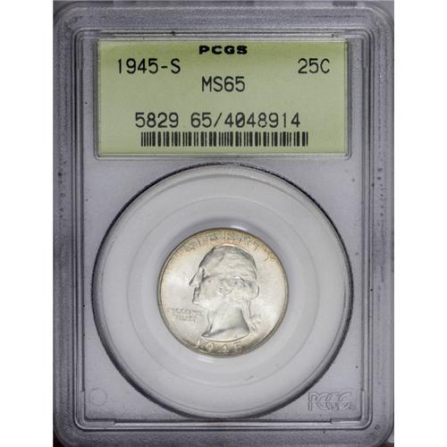 1945-S 25C MS65 PCGS. Trumpet tail S. Lustrous and nea 1945-S[25C] MS65 PCGS.