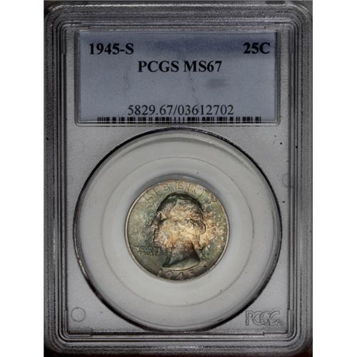 <B>1945-S<25C> MS67 PCGS.</B></I> Cobalt-blue, lavender, and gold-tan patina overlies highly lustrous surfaces. Sharply struck and exquisitely preserved. Population: 29 in 67, 0 finer (3/06).