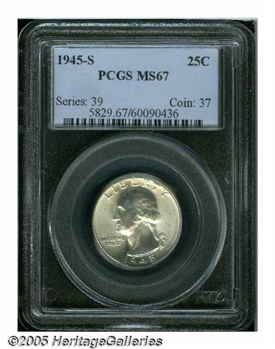<B>1945-S<25C> MS67 PCGS.</B></I> Fully struck and nearly pristine, with bright silver-gray surfaces that only have a few tiny contact marks on either side. Population: 27 in 67, 0 finer (4/05).