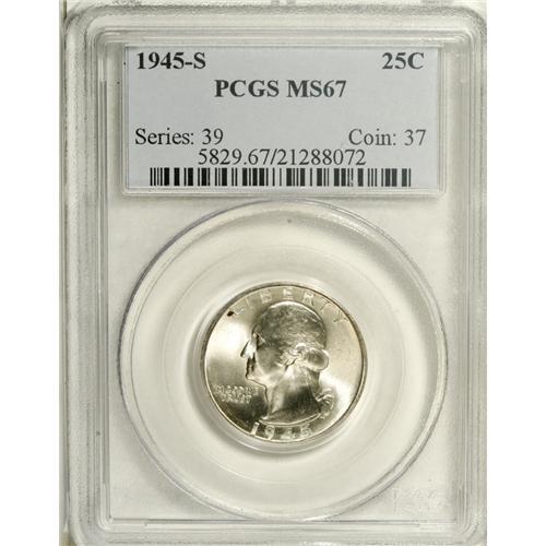 <B>1945-S 25C MS67 PCGS.</B></I> Practically untoned save for a small forest-green spot at the L of LIBERTY. This boldly impressed piece has exceptional and slightly frosty luster. Population: 30 in 67, 0 finer (1/07).<BR><BR><b>Shipping:</b> Coins & Currency (<a target="_blank" href="http://www.heritageauctions.com/common/shipping.php">view shipping information</a>)