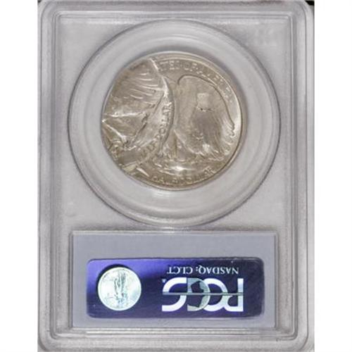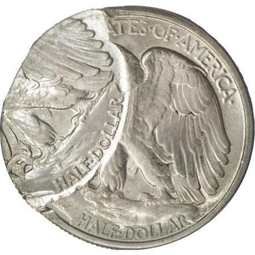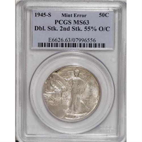 <B>1945-S 50C Walking Liberty Half--Double Struck, Second Strike 55% Off Center--MS63 PCGS.</B></I> Trumpet tail S. After the normal first strike, the piece failed to fully eject from the dies. It was struck again, widely off center, toward 6:30. The second strike is centered at 8:30 relative to the first strike. The mintmark is visible from the first strike where the two strikes overlap. This dramatic mint error is satiny and bagmark-free, and exhibits delicate ice-blue and chestnut-gold toning. A coin counter has left an inconspicuous patch of hairlines on the eagle's right (facing) wing from the first strike.<BR><BR><B>Coin Engraver:</B> Adolph A. Weinman<BR><BR><b>Shipping:</b> Coins & Currency (<a target="_blank" href="http://www.heritageauctions.com/common/shipping.php">view shipping information</a>)