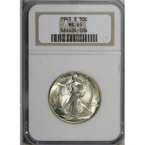 <B>1945-S 50C MS65 NGC.</B></I> NGC Census: (2237/515). PCGS Population (2964/598). Mintage: 10,156,000. Numismedia Wsl. Price for NGC/PCGS coin in MS65: $160. (#6626)<BR><BR><B>Coin Engraver:</B> Adolph A. Weinman<BR><BR><b>Shipping:</b> Coins & Currency (<a target="_blank" href="http://www.heritageauctions.com/common/shipping.php">view shipping information</a>)