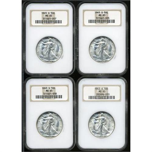 <B>(4)1945-S 50C MS65 PCGS.</B></I><BR><BR><B>Coin Engraver:</B> Adolph A. Weinman<BR><BR><b>Shipping:</b> Coins & Currency (<a target="_blank" href="http://www.heritageauctions.com/common/shipping.php">view shipping information</a>)