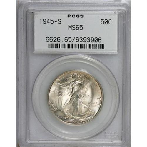 <B>1945-S 50C MS65 PCGS.</B></I> PCGS Population (2964/598). NGC Census: (2237/515). Mintage: 10,156,000. Numismedia Wsl. Price for NGC/PCGS coin in MS65: $160. (#6626)<BR><BR><B>Coin Engraver:</B> Adolph A. Weinman<BR><BR><b>Shipping:</b> Coins & Currency (<a target="_blank" href="http://www.heritageauctions.com/common/shipping.php">view shipping information</a>)