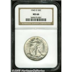 <B>1945-S 50C MS66 NGC.</B></I> Knob S. Nearly brilliant, this pleasing premium Gem provides potent luster and outstanding preservation. The strike is certainly above average although the branch hand is not fully struck.