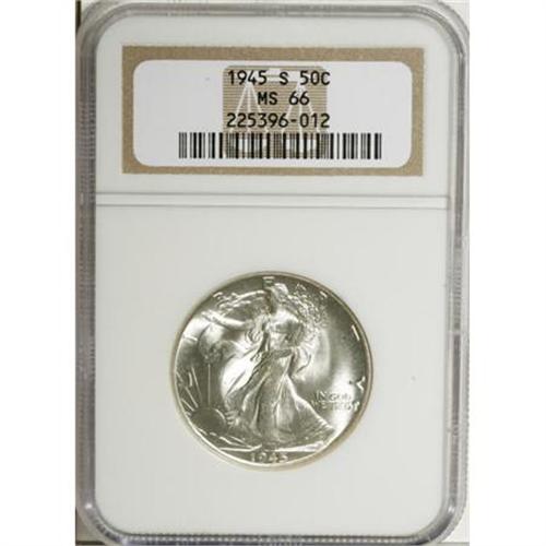 <B>1945-S 50C MS66 NGC.</B></I> NGC Census: (499/16). PCGS Population (601/2). Mintage: 10,156,000. Numismedia Wsl. Price for NGC/PCGS coin in MS66: $400. (#6626)<BR><BR><B>Coin Engraver:</B> Adolph A. Weinman<BR><BR><b>Shipping:</b> Coins & Currency (<a target="_blank" href="http://www.heritageauctions.com/common/shipping.php">view shipping information</a>)
