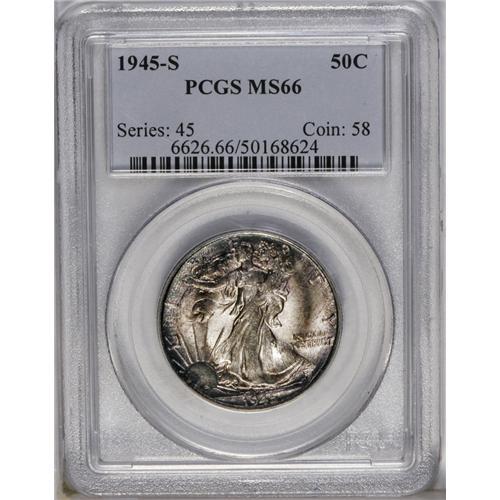 <B>1945-S<50C> MS66 PCGS.</B></I> A satiny Premium Gem with ice blue toning that surrounds untoned, largely mark-free devices. This San Francisco half has a better strike than most of the issue.