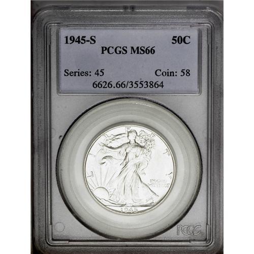 <B>1945-S<50C> MS66 PCGS.</B></I> Knob S. A mere dash of gold toning precludes full brilliance for this thoroughly lustrous and gorgeously preserved Premium Gem. The head and branch hand show typical definition, but the skirt lines are relatively sharp. <BR><BR><B>Important notice:</B> Heritage usually auctions material at the rate of 200-250 lots per hour. On some occasions eBay Live bid software or the Internet may not be able to keep up with the pace of the auction. We recommend placing a realistic absentee bid now as insurance to avoid disappointment. Occasionally the auctioneer may eliminate or reject an eBay Live bid, and the auctioneer may also reopen a lot after the close of the eBay live bidding (usually because we missed an audience bid), and may reject your bid even if it shows you as the winning bidder. By bidding via eBay Live, you agree that Heritage may award the lot to another bidder at its sole discretion under the circumstances described above or any other reasonable circumstances. Since eBay bids are not shown to us until we open the lot on the floor, we treat those bids just like floor bids. In most cases the floor responds before the eBay bid is presented to us, due to Internet lag time, so for consistency we have made it a policy that floor bids are always considered first over tie eBay live bids. Also please note that all Heritage lots purchased through eBay Live carry a 20% Buyer's Premium. Please make sure you read the Terms and Conditions before you bid. This lot is being auctioned in conjunction with a live floor auction by Heritage Galleries & Auctioneers. All final auction and invoice information will be supplied by Heritage Galleries & Auctioneers, and all other information should be considered preliminary. Lot:3021 <BR><BR><B>Winning Notification and Billing:</B> After the FINAL session in this auction is complete, Heritage will send e-mail and snail mail invoices. This process normally takes several days. All final auction and invoice information will be supplied by Heritage Galleries & Auctioneers, and all other information should be considered preliminary. <BR><BR>This auction will be conducted on a live auction floor and over the Internet through eBay Live. If you choose to place an absentee bid, please take a moment to <font color='#0000ff'><u><a href='http://pages.ebay.com/liveauctions/help/before/laabsentee.html'>learn how eBay Live absentee bidding works</a></u></font><font color='#000000'>