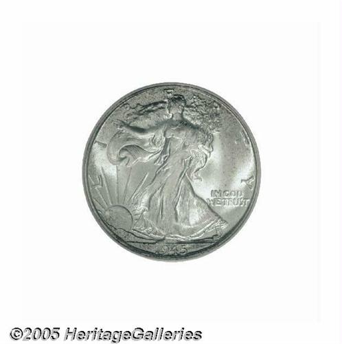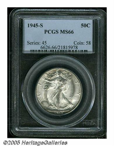 <B>1945-S<50C> MS66 PCGS.</B></I> This Superb Gem has brilliant and frosty silver luster with loads of eye appeal. Although this example is not fully struck, it is far above average for the issue. Bruce Fox noted: "Strike is almost always lacking in the central obverse and reverse and in the head area. This is an important condition rarity, for despite a substantial PCGS population in this grade, that service has only examined two coins that they considered to be finer. Population: 481 in 66, 2 finer (6/05).<BR><I>From The Robert Moreno Collection.</B></I>