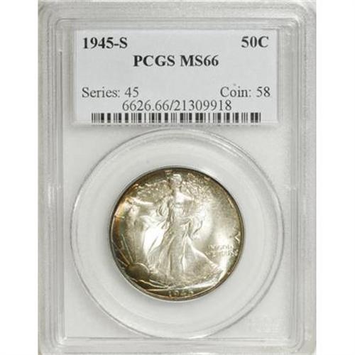 <B>1945-S 50C MS66 PCGS.</B></I> . PCGS Population (629/2). NGC Census: (503/17). Mintage: 10,156,000. Numismedia Wsl. Price for NGC/PCGS coin in MS66: $400. (#6626)<BR><BR><B>Coin Engraver:</B> Adolph A. Weinman<BR><BR><b>Shipping:</b> Coins & Currency (<a target="_blank" href="http://www.heritageauctions.com/common/shipping.php">view shipping information</a>)