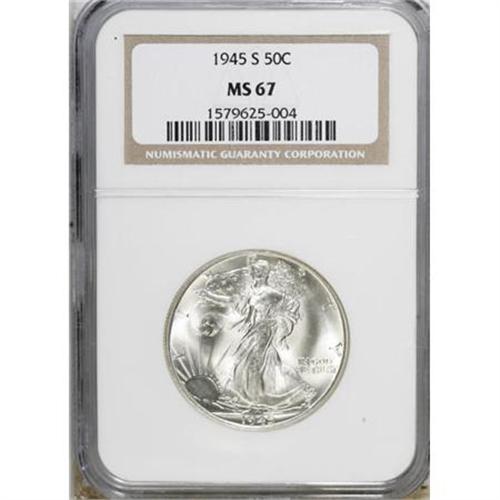 <B>1945-S 50C MS67 NGC.</B></I> Coruscating luster abounds on the white surfaces of this wonderful Superb Gem. A well executed strike leaves strong detail on the design features, including partial definition on the branch hand. Both sides are free of mentionable abrasions. Census: 17 in 67, 0 finer (1/08). <BR><BR><B>Coin Engraver:</B> Adolph A. Weinman<BR><BR><b>Shipping:</b> Coins & Currency (<a target="_blank" href="http://www.heritageauctions.com/common/shipping.php">view shipping information</a>)