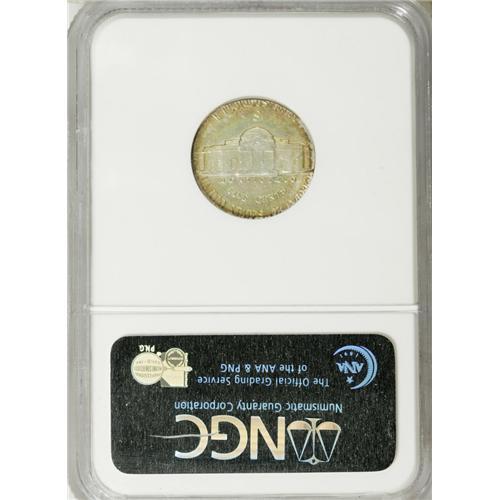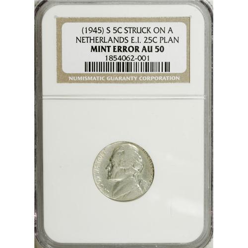 <B>1945-S 5C Jefferson Nickel--Struck on a Netherlands East Indies 25 Cent Planchet--AU50 NGC.</B></I> Nicely centered, although the top third of the date is off the flan. Ample luster remains. The obverse is slate-gray, while the reverse is brightly toned lime-green and pink-gold.<BR><BR><b>Shipping:</b> Coins & Currency (<a target="_blank" href="http://www.heritageauctions.com/common/shipping.php">view shipping information</a>)