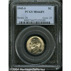 <B>1945-S<5C> MS66 Full Steps PCGS.</B></I> Lustrous surfaces are visited by nearly imperceptible faint olive-milky color. Sharply struck, with just a coupled of trivial marks on Monticello. Population: 52 in 66, 4 finer (9/04).<BR><I>From The Gene Holland Collection of United States Coins, Part One.</B></I> <BR><BR><B>Important notice:</B> Heritage usually auctions material at the rate of 200-250 lots per hour. On some occasions eBay Live bid software or the Internet may not be able to keep up with the pace of the auction. We recommend placing a realistic absentee bid now as insurance to avoid disappointment. Occasionally the auctioneer may eliminate or reject an eBay Live bid, and the auctioneer may also reopen a lot after the close of the eBay live bidding (usually because we missed an audience bid), and may reject your bid even if it shows you as the winning bidder. By bidding via eBay Live, you agree that Heritage may award the lot to another bidder at its sole discretion under the circumstances described above or any other reasonable circumstances. Since eBay bids are not shown to us until we open the lot on the floor, we treat those bids just like floor bids. In most cases the floor responds before the eBay bid is presented to us, due to Internet lag time, so for consistency we have made it a policy that floor bids are always considered first over tie eBay live bids. Also please note that all Heritage lots purchased through eBay Live carry a 20% Buyer's Premium. Please make sure you read the Terms and Conditions before you bid.