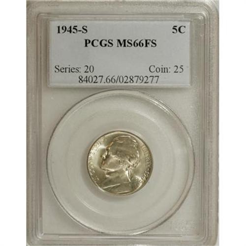 <B>1945-S 5C MS66 Full Steps PCGS.</B></I> The design elements are crisply struck, and intense, coruscating luster flashes over both sides. Only slight hints of gold color keep the piece from being fully untoned. Surface marks are minimal. Population: 80 in 66 Full Steps, 4 finer (8/07). <BR><BR><b>Shipping:</b> Coins & Currency (<a target="_blank" href="http://www.heritageauctions.com/common/shipping.php">view shipping information</a>)