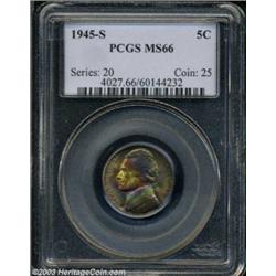 <table><tr><td><TABLE cellSpacing=0 cellPadding=0 width="100%" bgColor=#000000 border=0><TBODY> <TR><TD width="100%"><TABLE cellSpacing=1 cellPadding=3 width="100%" border=0><TBODY><TR><TD width="100%" bgColor=#79735c><FONT face=arial color=#ffffff size=3><B>Description</B> </FONT></TD></TR><TR><TD width="100%" bgColor=#ffffff><FONT face=arial size=2><B>1945-S 5C MS66 PCGS.</B></I> Superbly toned over the obverse in rainbow-like colors of jade-green, crimson-red, magenta, and antique-gold, the reverse displays some splotchy golden-russet patina. Well struck, a couple of small abrasions are noted also on the reverse. </FONT></TD></TR></TBODY></TABLE></TD></TR></TBODY></TABLE><BR><A name=PricesRealized></A><TABLE cellSpacing=0 cellPadding=0 width="100%" bgColor=#000000 border=0><TBODY><TR><TD width="100%"><TABLE cellSpacing=1 cellPadding=3 width="100%" border=0><TBODY><TR><TD width="100%" bgColor=#79735c><A name=PR><FONT face=arial color=#ffffff size=3><B>Previous Prices from Heritage Auctions</B> </FONT></A></TD></TR><TR><TD bgColor=#f6f6ed><TABLE cellSpacing=0 cellPadding=0 width="100%" border=1><TBODY><TR><TD align=middle width="33%"><B>Date</B></TD><TD align=middle width="33%"><B>Service</B></TD><TD align=middle width="33%"><B>Price</B></TD></TR><TR bgColor=whitesmoke><TD width="33%"><B>08/26/2003</B></TD><TD width="33%">NGC</TD><TD width="33%">$12.65</TD></TR><TR bgColor=whitesmoke><TD width="33%"><B>08/19/2003</B></TD><TD width="33%">NGC</TD><TD width="33%">$12.65</TD></TR><TR bgColor=whitesmoke><TD width="33%"><B>04/23/2002</B></TD><TD width="33%">NGC</TD><TD width="33%">$41.40</TD></TR><TR bgColor=whitesmoke><TD width="33%"><B>08/07/2001</B></TD><TD width="33%">PCGS</TD><TD width="33%">$19.00</TD></TR><TR bgColor=whitesmoke><TD width="33%"><B>04/17/2001</B></TD><TD width="33%">ANACS</TD><TD width="33%">$51.00</TD></TR><TR bgColor=whitesmoke><TD width="33%"><B>02/08/2000</B></TD><TD width="33%">ANACS</TD><TD width="33%">$12.00</TD></TR><TR bgColor=whitesmoke><TD width="33%"><B>01/04/2000</B></TD><TD width="33%">NGC</TD><TD width="33%">$15.00</TD></TR><TR bgColor=whitesmoke><TD width="33%"><B>12/07/1999</B></TD><TD width="33%">NGC</TD><TD width="33%">$13.00</TD></TR></TBODY></TABLE></TD></TR><TR><TD bgColor=#ffffff><FONT face=arial size=1 ?>PLEASE NOTE: All prices realized reflect the final hammer price PLUS the buyer's premium in auctions that charge a buyer's premium. Each item has a notation at the top of the listing indicating whether that lot included a buyer's premium. Example: A item that sells with a final hammer price of $100 and a 20% buyer's premium will display with a price realized of $120. All information listed is intended to be as accurate as possible, but errors are possible. Please use this guide carefully and inform us of any inaccuracies. </FONT></TD></TR></TBODY></TABLE></TD></TR></TBODY></TABLE><BR><TABLE cellSpacing=0 cellPadding=0 width="100%" bgColor=#000000 border=0><TBODY><TR><TD width="100%"><TABLE cellSpacing=1 cellPadding=3 width="100%" border=0><TBODY><TR><TD width="100%" bgColor=#79735c colSpan=6><FONT face=arial color=#ffffff size=3><B>Price Guide*</B> </FONT></TD></TR><TR bgColor=#f6f6ed><TD align=middle><B>Grade</B> </TD><TD align=middle><B>Coin World<BR>(Trends)</B> </TD><TD align=middle><B>Numismedia<BR>Retail</B> </TD><TD align=middle><B>Numismedia<BR>Wholesale</B> </TD><TD align=middle><B>Coin<BR>Universe</B> </TD><TD align=middle><B>Heritage<BR>Value Index</B> </TD></TR><TR bgColor=#ffffff><TD align=middle>65</TD><TD align=right>---</TD><TD align=right>$18.00</TD><TD align=right>$14.00</TD><TD align=right>$20.00</TD><TD align=right>$14.00</TD></TR><TR style="FONT-WEIGHT: bold" bgColor=#cccfdd><TD align=middle>66</TD><TD align=right>---</TD><TD align=right>$31.00</TD><TD align=right>$24.00</TD><TD align=right>$35.00</TD><TD align=right>$24.50</TD></TR><TR bgColor=#ffffff><TD align=middle>67</TD><TD align=right>---</TD><TD align=right>$72.00</TD><TD align=right>$55.00</TD><TD align=right>$70.00</TD><TD align=right>$35.30</TD></TR><TR bgColor=#ffffff><TD colSpan=6><FONT size=1>*All information listed is intended to be as accurate as possible, but errors are possible. No item may be returned or refused based on this information which is provided as a service to our customers. You should contact each pricing source directly to determine the accuracy of this information. </FONT></TD></TR></TBODY></TABLE></TD></TR></TBODY></TABLE><BR><TABLE cellSpacing=0 cellPadding=0 width="100%" bgColor=#000000 border=0><TBODY><TR><TD width="100%"><TABLE cellSpacing=1 cellPadding=3 width="100%" border=0><TBODY><TR><TD width="100%" bgColor=#79735c><FONT face=arial color=#ffffff size=3><B>Population Guide</B> </FONT></TD></TR><TR bgColor=#ffffff><TD align=middle><!-- Begin Output of Population Grid--><TABLE cellSpacing=0 cellPadding=0 width="100%" border=0><TBODY><TR><TD vAlign=center><TABLE cellSpacing=0 width="100%" border=1 cellsadding="3"><TBODY><TR><TD vAlign=center><TABLE cellSpacing=0 cellPadding=3 width="100%" border=1><TBODY><TR><TD vAlign=center align=middle bgColor=#f0f1e8 colSpan=2 <CENTER><FONT face=Arial size=2><B>PCGS Pop </B></FONT><CENTER></CENTER></TD><TD vAlign=center align=middle bgColor=#f0f1e8 colSpan=2><CENTER><FONT face=Arial size=2><B>NGC Pop</B></CENTER></FONT></TD></TR><TR><TD vAlign=center><FONT face=Arial size=2>(66)</FONT> </TD><TD vAlign=center align=right><FONT face=Arial size=2>510</FONT> </TD><TD vAlign=center><FONT face=Arial size=2>(66)</FONT> </TD><TD vAlign=center align=right><FONT face=Arial size=2>1180</FONT> </TD></TR><TR><TD vAlign=center><FONT face=Arial size=2>(>66)</FONT> </TD><TD vAlign=center align=right><FONT face=Arial size=2>46</FONT> </TD><TD vAlign=center><FONT face=Arial size=2>(>66)</FONT> </TD><TD vAlign=center align=right><FONT face=Arial size=2>1220</FONT> </TD></TR></TBODY></TABLE></TD></TR></TBODY></TABLE></TD></TR></TBODY></TABLE><!-- End Output of Population Grid--></TD></TR></TBODY></TABLE></TD></TR></TBODY