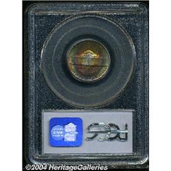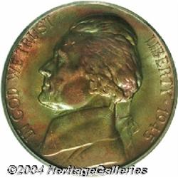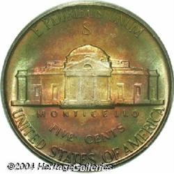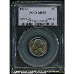 <B>1945-S<5C> MS68 PCGS.</B></I> Intense forest-green, ruby-red, gold, and rose-violet colors form concentric bands across both sides of this shimmering Superb Gem. Well preserved and reasonably struck with no finer examples at either service. Population: 1 in 68, 0 finer (9/04). <BR><BR><B>Important notice:</B> Heritage usually auctions material at the rate of 200-250 lots per hour. On some occasions eBay Live bid software or the Internet may not be able to keep up with the pace of the auction. We recommend placing a realistic absentee bid now as insurance to avoid disappointment. Occasionally the auctioneer may eliminate or reject an eBay Live bid, and the auctioneer may also reopen a lot after the close of the eBay live bidding (usually because we missed an audience bid), and may reject your bid even if it shows you as the winning bidder. By bidding via eBay Live, you agree that Heritage may award the lot to another bidder at its sole discretion under the circumstances described above or any other reasonable circumstances. Since eBay bids are not shown to us until we open the lot on the floor, we treat those bids just like floor bids. In most cases the floor responds before the eBay bid is presented to us, due to Internet lag time, so for consistency we have made it a policy that floor bids are always considered first over tie eBay live bids. Also please note that all Heritage lots purchased through eBay Live carry a 20% Buyer's Premium. Please make sure you read the Terms and Conditions before you bid.
