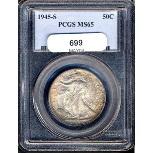 <b>1945-S Liberty Walking Half Dollar. PCGS graded MS65.</b> Medium to deep "dappled" toning over both surfaces. Lustrous gem <b>(PCGS # 6626)</b> <i>